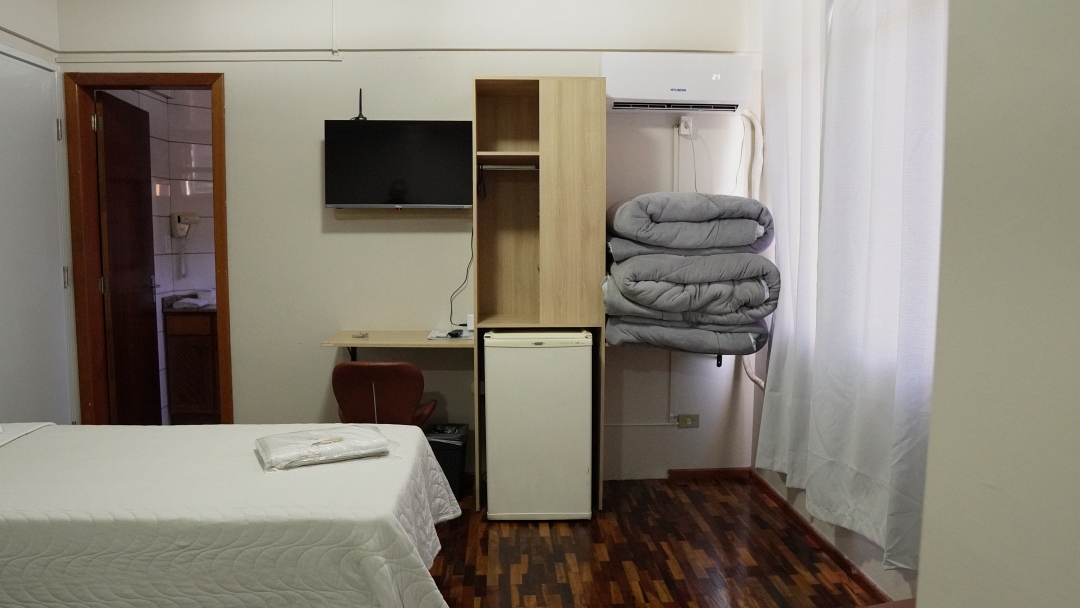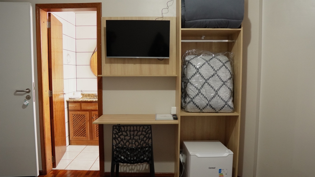 Apartamentos sujeitos a alterações em relação ao tamanho do quarto, banheiro e marca de ar‑condicionado e frigobar.